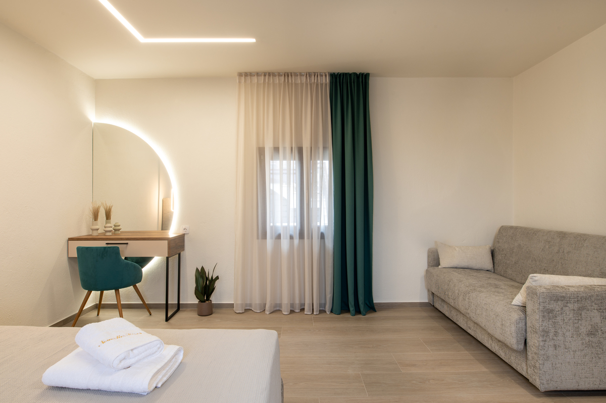 Το υπνοδωμάτιο είναι άνετο, εξοπλισμένο με ένα διπλό κρεβάτι και έναν καναπέ-κρεβάτι, εξασφαλίζοντας ξεκούραστο ύπνο. Στον ενιαίο χώρο της σαλοκουζίνας θα βρείτε έναν επιπλέον καναπέ-κρεβάτι, τραπεζαρία για γεύματα και πλήρως εξοπλισμένη κουζίνα με όλα τα απαραίτητα για την προετοιμασία φαγητού.